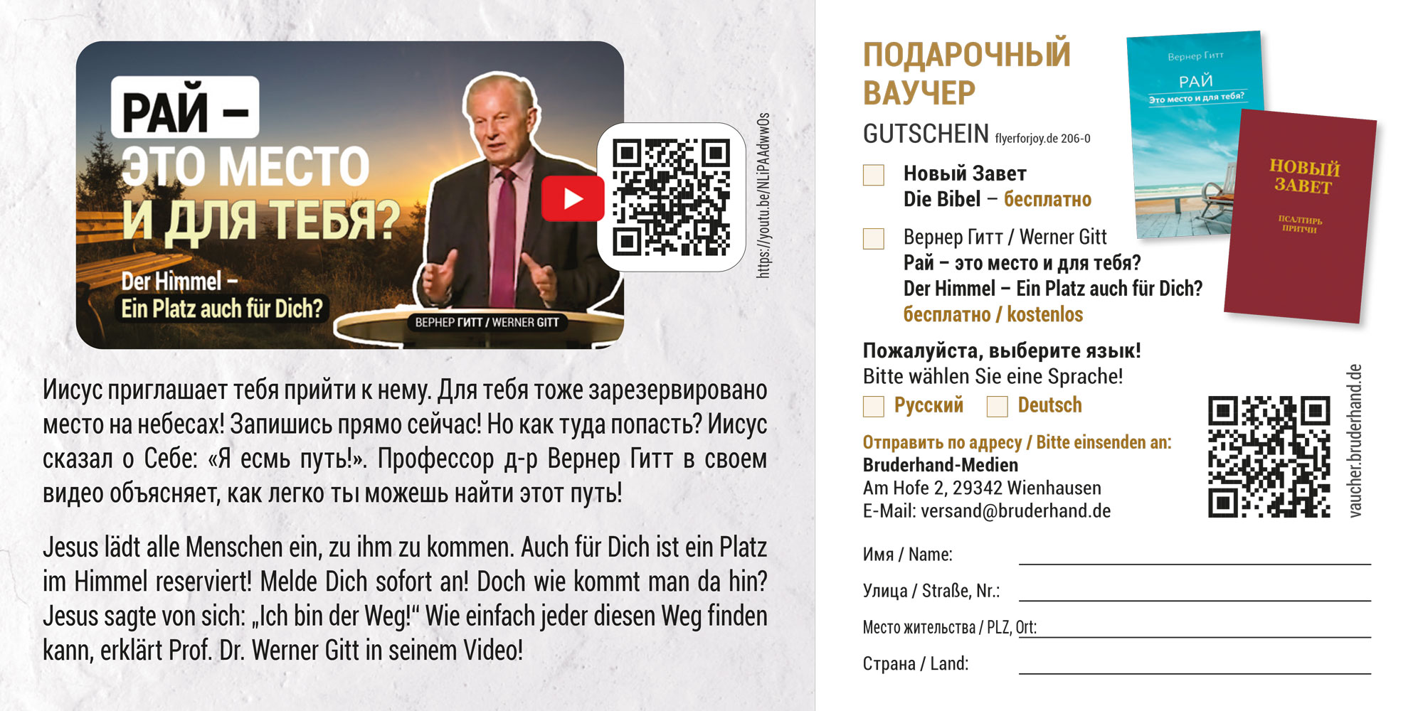 Außerdem befindet sich auf dem Flyer ein Gutschein für das Buch "Der Himmel – Ein Platz auch für dich?" und für ein Neues Testament (Deutsch/Russisch).